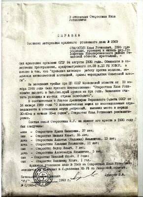 На момент ареста имел семерых малолетних детей. Жена Старостина Ирина Павловна, 1893 г.р.