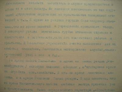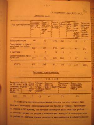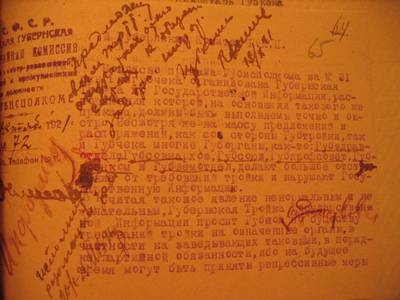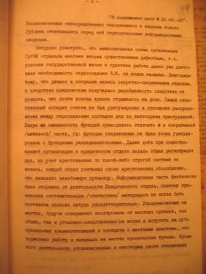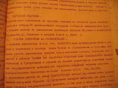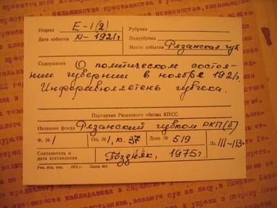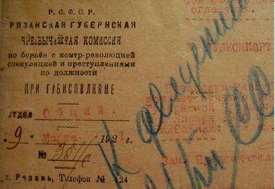 "В Данковском уезде Рязанской губернии были установлены многочисленные факты злоупотреблений в работе местной ЧК. По данным ревизора Родионова, часто обыски проходили без ордеров, у гражданки Лебедевой А.А. обыски проводились 15 раз, пока не очистили совершенно квартиру, не брезгуя даже детскими игрушками".