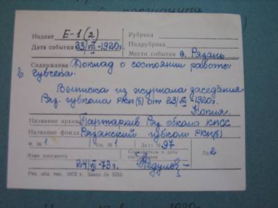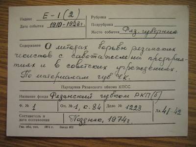 29. "О методах борьбы рязанских чекистов с саботажем на предприятиях и в советских учреждениях". Воспоминания рязанских чекистов, записанные сотрудниками Агитпропотдела Рязанского Губернского комитета ВКП(б): "Из истории и организации Рязанской губернской Чрезвычайной комиссии, борьба с контрреволюцией в губернии".