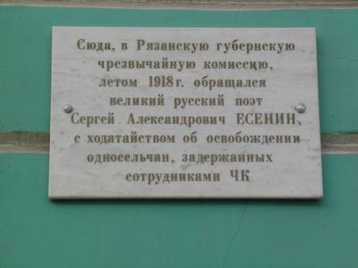 Памятная доска, установленная на здании Рязанской ГубЧК (ОГПУ, НКВД, КГБ, ФСБ): "Сюда, в рязанскую губернскую Чрезвычайную комиссию, летом 1918 г. обращался великий русский поэт Сергей Александрович ЕСЕНИН, с ходатайством об освобождении односельчан, задержанных сотрудниками ЧК". Адрес (соврем.): Рязань, ул. Астраханская (Ленина), дом 46. Проезд городским транспортом до остановок: Дворец бракосочетаний(Библиотека имени Горького), Цирк. GPS-координаты: 54°37'48.35"С, 39°44'34.77"В. Место на Яндекс-карте: https://yandex.ru/maps/-/CDt-YDmE