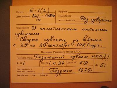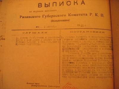 16. О состоянии деятельности Рязанской Губчека. Выписка из протокола заседания Рязанского Губкома РКП(б) от 01.10.1921 г.