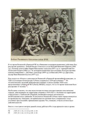1920-е. Бойцы Рязанского батальона ВЧК (Рязанская ГубЧК). Рязанский батальон ВЧК принимал участие в подавлении восстания рабочих в районе Ижевского-Воткинских заводов. Участвовал в подавлении крестьянских выступлений в Рязанской губернии. Участвовал в подавлении восстаний мобилизованных в Касимовском, Раннебурском, Сапожковском, Пронском, Михайловском, Рязанском уездах, а также на ж/д линии Рязань—Ряжск, станциях Хрущево, Шилово, Юзиково, Александро-Невская, Урусове, Чемодановка, Биркино. Рязанский батальон ВЧК принимали участие в подавлении восстаний крестьян в Тамбовской губернии, в Шацком уезде. СМ. ПОДРОБНЕЕ: Рязанская губернская Чрезвычайная комиссия.