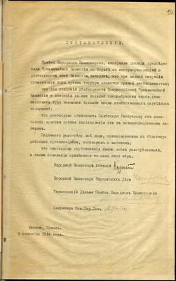 По данному приказу с 10-ти часов вечера до 5-ти часов утра воспрещалось движение по улицам города, сел и деревень без особого на то разрешения, выдаваемого за подписью ответственных и печатью советского учреждения. Предписывалось городской милиции, а в селениях комитетам бедноты, усилить охрану города, сел и деревень и наблюдение за порядком – вводилось военное положение.