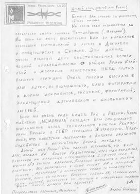 Из воспоминаний заключенного рязанского лагеря НКВД 178-454, интернированного Феликса Робака (Felix Robak), записанных в 1992 году: «... Как известно, польские интернированные рядовые и подофицеры АК использовались советской комендатурой лагеря на различных работах за зоной, в первую очередь – на тяжелых погрузочно-разгрузочных работах, на земляных, сельскохозяйственных и тому подобное. Это было поначалу.