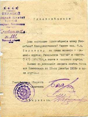 Удостоверение Оханского уездного парткомитета на право ношения оружия на имя коммуниста Болотова Степана Архиповича. 1919.