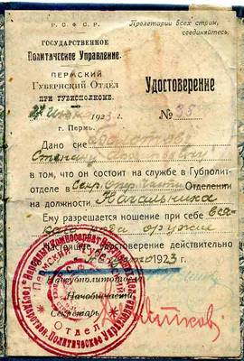 Страница удостоверения Пермского Губотдела ГПУ на Болотова Степана Архиповича, о том, что он является начальником секретно оперативной части и ему разрешено ношение всякого оружия. 1923.