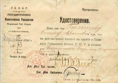 Удостоверение Пермского Губернского отдела ГПУ о том, что Болотов Степан Архипович является начальником секретно оперативной части. 1922.
