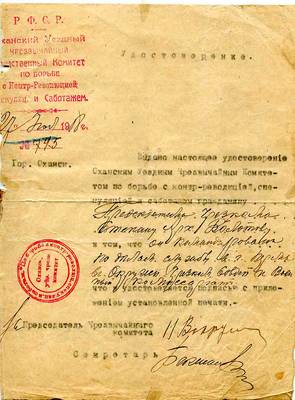 Командировочное удостоверение Оханской ЧК на имя ее председателя Болотова Степана Архиповича. 1918.