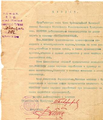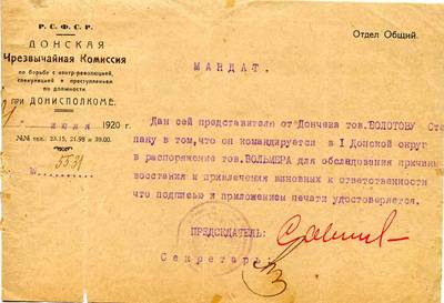 Мандат Донской ЧК о командировании Болотова Степана Архиповича для обследования причины восстания и привлечения виновных. 1920.