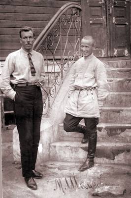 Чекисты Болотов Степан Архипович и Шолохов Михаил Александрович. Двор ОГПУ в г. Миллерово. На обороте фотографии надпись: "Шолохову 27 лет. Писал "Тихий Дон", первую книгу."