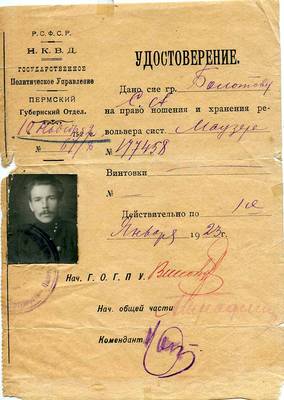 21. Удостоверение Пермского Губотдела ГПУ на право ношения маузера Болотовым Степаном Архиповичем. 1922.