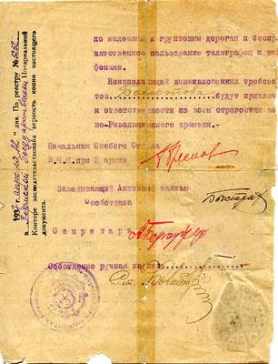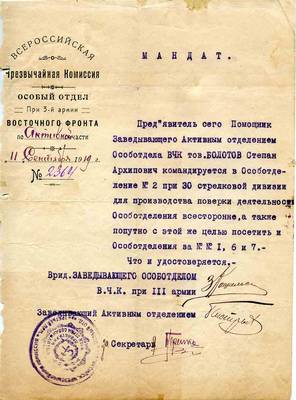 Мандат на проверку деятельности Особого отдела ВЧК при 3-й Армии Восточного Фронта на имя Болотова Степана Архиповича. 1919.