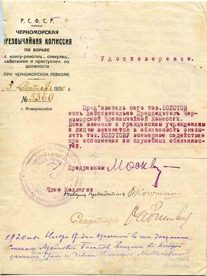 10. Удостоверение Черноморской ЧК о должности Болотова Степана Архиповича. 1920.