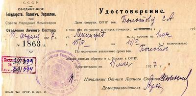 Отпускное удостоверение ОГПУ на имя Болотова Степана Архиповича в Ленинград. 1927.