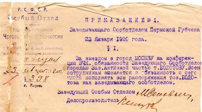 Приказ по Особому отделу Пермской ЧК о должностных полномочиях Болотова Степана Архиповича. 1920.