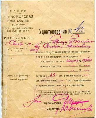 7. Удостоверение Черноморской ЧК на право ношения оружия на имя Болотова Степана Архиповича. 1920.