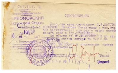 Удостоверение, выданное Полномочным Представительством ОГПУ по Северо-Кавказскому краю, на имя Болотова Степана Архиповича – начальника Донецкого Окружного ОГПУ. 1927. Находится в частной коллекции.