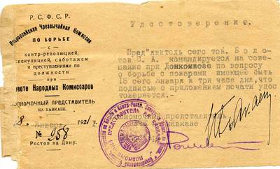 Удостоверение, выданное Полномочным Представителем ВЧК на Кавказе (Ростов-на-Дону), о том, что Болотов Степан Архипович является сотрудников ПП ВЧК на Кавказе. 1921.