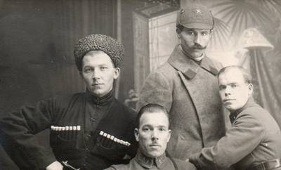 42. Фотография уроженцев деревни Тупики Острожской волости Оханского уезда Пермской губернии. Стоит чекист Болотов Степан Архипович