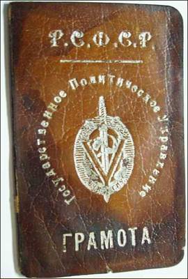 Обложка Наградного удостоверения чекиста Болотова Степана Архиповича, награжденного нагрудным знаком 5 лет ВЧК-ГПУ. 1923. Находится в частной коллекции.