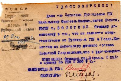 Удостоверение Пермского ГПУ о полномочиях Болотова Степана Архиповича. 1922.