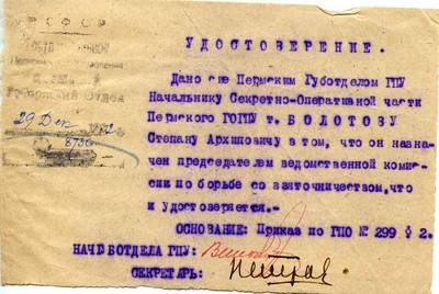 Удостоверение Пермского Губернского отдела ГПУ о том, что Болотов Степан Архипович является председателем ведомственной комиссии по борьбе со взяточничеством. 1922.