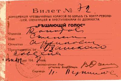 Билет N 23 делегата с правом решающего голоса конференции Чрезвычайных Комиссий (возможно, Пермской губернии) на имя Болотова Степана Архиповича. 1918.