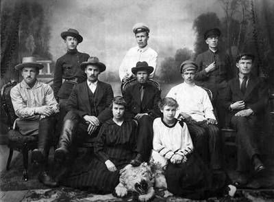 Фотография сотрудников уездной ЧК г. Венев Тульской губернии. 1918. Стоят: счетовод А.И. Оводов, секретарь Куликов, бухгалтер Федор Ежов. Сидят в среднем ряду чекисты: Фатеев, Яков Яковлевич Юдейко, председатель Иван Матвеевич Рогожин, Михаил Иванович Стриженов, Демин. Сидят в нижнем ряду:машинистка Ермакова, делопроизводитель П.Я. Юдейко. 1918 год. Электронная копия была приобретена на антикварном рынке у неизвестного лица в феврале 2010 года. Копийный материал Архивной коллекции Рязанского общества "Мемориал".