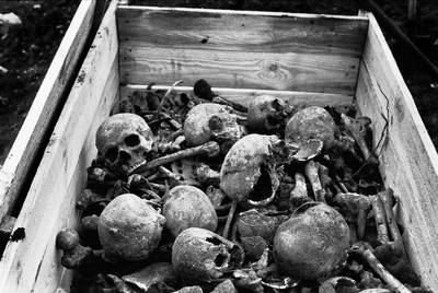 9. Фото. 1993. Останки расстрелянных, обнаруженные в котловане у Лазаревского кладбища Рязани. При строительных работах на улице им. Ленинского комсомола у Лазаревского кладбища города обнаружены рвы с телами репрессированных в годы сталинского террора жителей региона. Рязанский Мемориал, совместно с религиозными организациями и группой депутатов Городского Совета добился перезахоронения погибших на территории Мемориального комплекса памяти (т.н. “Немецкое кладбище”, Дягилево, Недостоево, ул. Магистральная). На месте перезахоронения позже был установлен Памятный Знак работы Рязанского скульптора Василия Горбунова. (Подробнее об этом см. http://stopgulag.org/object/60636903 )