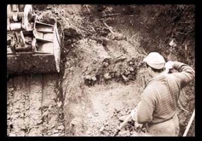 8. Фото. 1993. Останки расстрелянных, обнаруженные в котловане у Лазаревского кладбища Рязани. При строительных работах на улице им. Ленинского комсомола у Лазаревского кладбища города обнаружены рвы с телами репрессированных в годы сталинского террора жителей региона. Рязанский Мемориал, совместно с религиозными организациями и группой депутатов Городского Совета добился перезахоронения погибших на территории Мемориального комплекса памяти (т.н. “Немецкое кладбище”, Дягилево, Недостоево, ул. Магистральная). На месте перезахоронения позже был установлен Памятный Знак работы Рязанского скульптора Василия Горбунова.