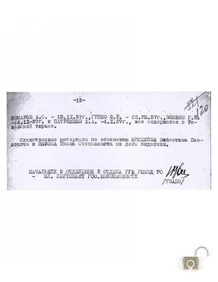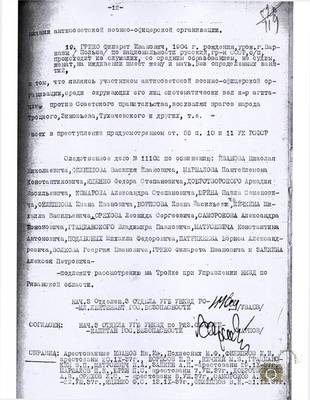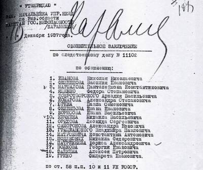Обвинительное заключение по следственному делу № 11102 за подписью начальника 3-го отделения 3-го отдела УГБ УНКВД по Рязанской области младшего лейтенанта государственной безопасности Уваева. Утверждено начальником 3-го отдела УГБ УНКВД по Рязанской области капитаном государственной безопасности Карповым и заместителем начальника управления НКВД по Рязанской области капитаном государственной безопасности Карамышевым 11 декабря 1937 г. Групповое дело Рязанского УНКВД по обвинению 19 бывших офицеров, проживавших в городе Скопин Рязанской области, в создании контрреволюционной военно-офицерской организации, направленной на свержение советской власти. (скопинское офицерское дело).