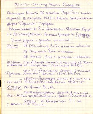 12 февраля 1877 г.р. (61 год). Село Починки, Егорьевский уезд, Рязанская губерния. Окончил курс в железнодорожном техническом училище, полный курс в Казанском пехотном юнкерском училище по 1-му разряду. 2 июля 1898 года -10-й Гренадерский Малороссийский полк, вольноопределяющийся 2-го разряда. 28 июля 1901 года - подпрапорщик. 14 ноября 1901 года - подпоручик в 16-м пехотном Ладожском полку. В 10-м Гренадерском полку - поручик, штабс-капитан, помощник начальника хозяйственной части полка, командир роты. В Первую Мировую войну участвует в боевых действиях. В начале 1915 года - капитан. В 1916-м - подполковник и командир батальона. Награжден Георгиевским оружием. Место жительства: Рязанская область, Скопинский район, г. Скопин. Перед арестом в 1937-м году работал техником-проектировщиком селикатного треста. Староста православного церковного прихода в Скопине. Арестован 07.08.1937 года в г. Скопин. Содержался в рязанской тюрьме. Приговорен 10.12.1937 года Тройкой УНКВД по Рязанской области по групповому делу по ст. 58 УК РСФСР "как участник антисоветской военно-офицерской организации" (т.н. Скопинское офицерское дело) к ВМН. Расстрелян 05.01.1938 года в Рязани. Посмертно реабилитирован 20 лет спустя, 20.09.1957 года. Арх. дело №5245 в УФСБ по Рязанской области. Вероятное место захоронения: двор Старообрядческой Церкви на Скорбящинском кладбище г. Рязань.