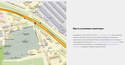 Точка мемориала на Google-карте: MJF7+FJ Рязань, Рязанская обл. Широта: 54°40'25.81"С Долгота: 39°36'50.90"В. Рязань, ул. Прижелезнодорожная, 12. Место на Яндекс-карте: https://yandex.eu/maps/-/CDxNM8ka