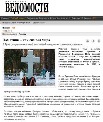 Памятный Знак румынам, погибшим в лагерном спецгоспитале НКВД N 5963 под поселком Тума в Клепиковском районе Рязанской области. Памятный Знак открыт 29 ноября 2010 года при участии в церемонии делегации Румынии во главе с Послом Константином-Михаилом Григорие. Кладбище спецгоспиталя НКВД N 5963 под поселком Тума в Клепиковском районе Рязанской области. Мемориальный комплекс создан в 1990-е годы усилиями общественных институций и государственных организаций разных стран. Самой большой вклад в обустройство кладбища внес Немецкий Народный Союз по уходу за могилами жертв войны. Реализацией проекта и проблемами ухода за местом захоронения занималась Ассоциация международного военно-мемориального сотрудничества "Военные Мемориалы". Комплекс создан на месте разрушенного и заброшенного кладбища спецгоспиталя НКВД N 5963 под поселком Тума в Клепиковском районе Рязанской области.