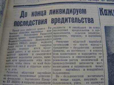 "До конца ликвидируем последствия вредительства". Секретарь Оргбюро ЦК ВКП(б) по Рязанской области Тарасов, член Тройки Рязанского УНКВД, на конференции подчеркнул: " <...> Еще выше поднимем революционную бдительность, будем и впредь под руководством Ленинско-Сталинского ЦК ВКП(б) и товарища Сталина беспощадно громить и выкорчевывать врагов народа, предателей нашей родины <...> Разгромлены осиные гнезда врагов народа, но еще остались их презренные последыши..."
