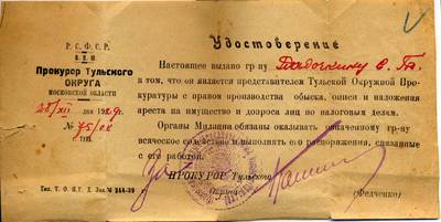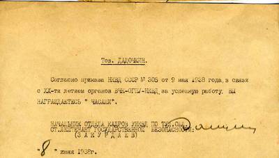 Дадочкин Семен Трофимович, 1902 г.р. Служил в ОГПУ, позднее в НКВД, в Туле, на рязанских территориях, в Москве. В августе 1939 года был исключен из компартии за применение незаконных методов на допросах и осужден на 5 лет лишения свободы.