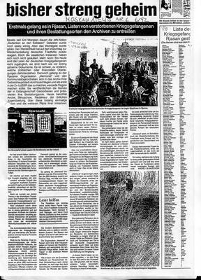 Копия статьи председателя Рязанского "Мемориала" Андрея Блинушова о Рязанском лагере НКВД 178-454 в немецком выпуске газеты "Московские новости". N6 1992. На нем. языке.