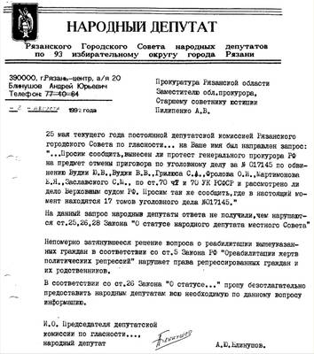 18. Запрос БлинушоваА.Ю. в прокуратуру о реабилитации осужденных членов "группы Вудки". 1992.