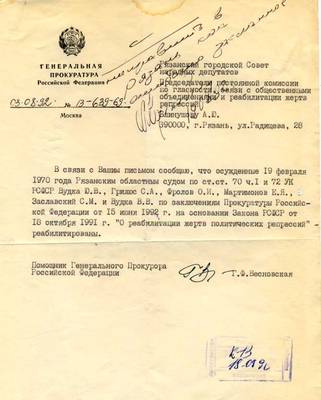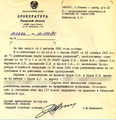19. Письмо прокуратуры Рязанской области о реабилитации осужденных членов "группы Вудки". 1992.