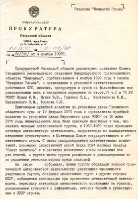 19. Письмо прокуратуры Рязанской области о реабилитации осужденных членов "группы Вудки". 1992.