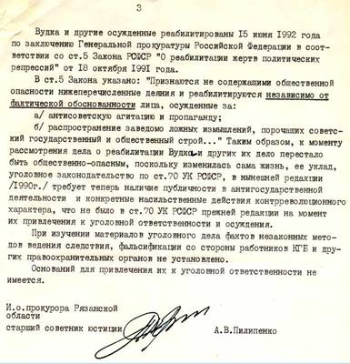 21. Письмо помощника Генпрокурора РФ о реабилитации членов "группы Вудки". 1992.
