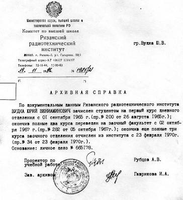 20. Архивная справка РРТИ на Вудку Юрия Вениаминовича. 1996.