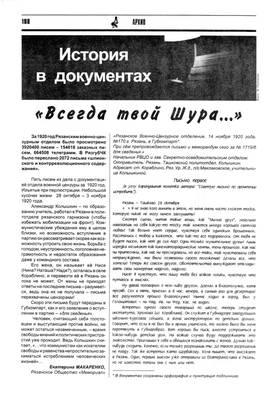 Автор писем - Александр Колышкин, по образованию учитель, служил в политотделе Рязанского гарнизона. Письма направлял в село Кораблино Рязанской губернии жене Нюсе. Письма были перехвачены военной цензурой и переданы в Губкомпарт. Публикацию подготовила исследователь Рязанского Мемориала Екатерина Макаренко для Российского исторического журнала "Карта" NN34-35, стр. 108-111.